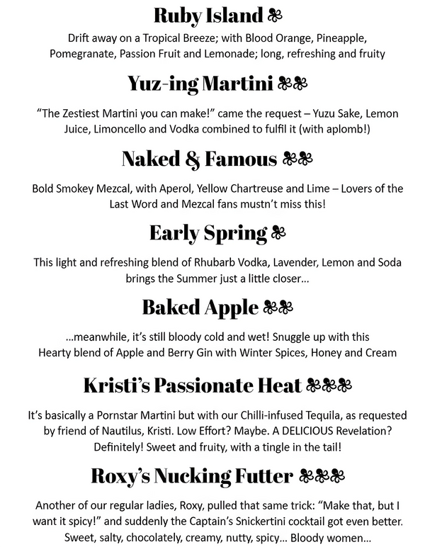 Our extensive range of cocktails and mocktails are available all year round from our menu. Why not compliment your cocktail or mocktail with a bowl of Nautilus Nibbles in our undersea emporium?
