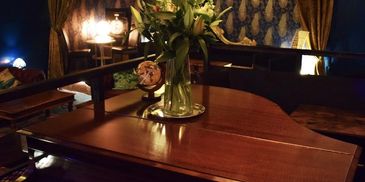 We're rigged up to play backing tracks or link your guitar to the PA, and (of course) you're welcome to make use of our baby grand; or simply come along and appreciate the range of talent on display!